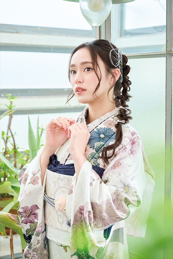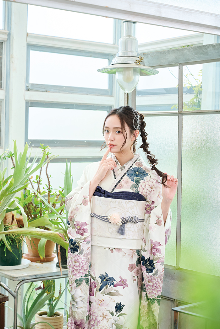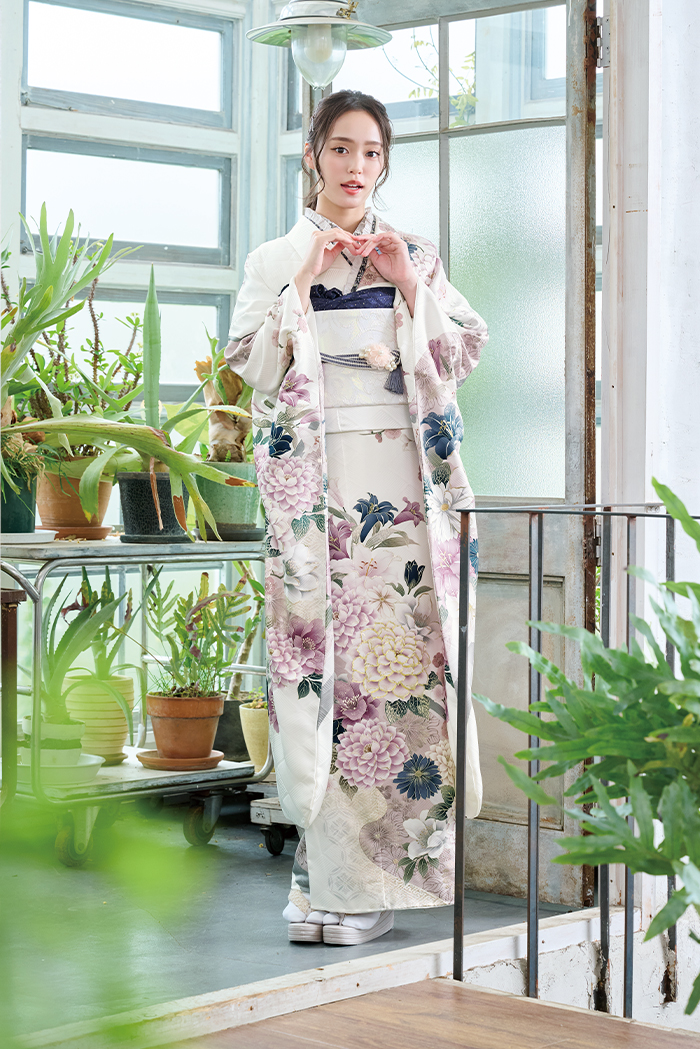振袖コレクション 26-S812 振袖№ 26-S812 ホワイトベースに百合・菊・牡丹など四季草花柄の 派手すぎない個性あふれる振袖。 ※モデルのコーディネートはイメージです。 ※画像と現物の色が多少異なる場合があります。